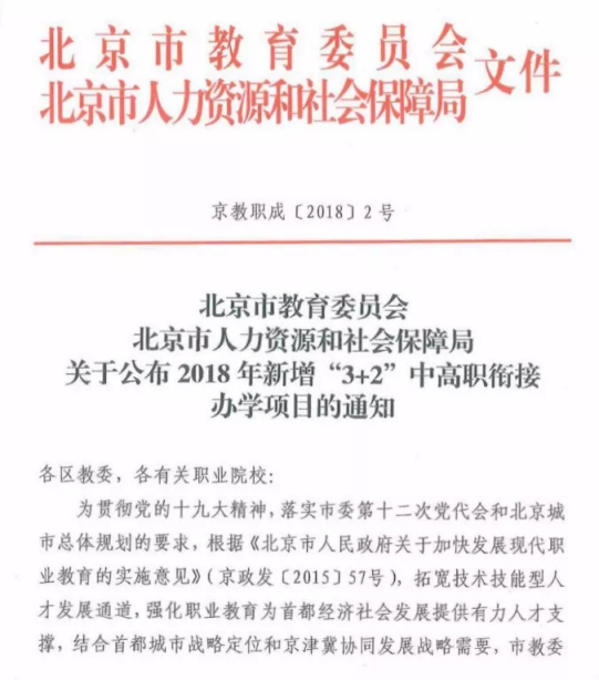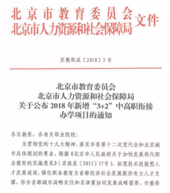 “3+2”中高职衔接项目是市教委在职业院校开展的中高职衔接项目,旨在通过合作,促进中高职学校发挥各自优势,与行业企业密切合作,联合培养高技能人才的一种办学形式。2012年北京市教委下发《关于开展中高等职业教育衔接办学工作试点的通知》,当年在17所中高职院校中试点高职“3+2”模式,目前,“3+2”中高职衔接项目从最初的9所中职校与8所高职院校在10个专业开展,试点规模逐年扩大。在人才培养上,“3+2”中高职衔接班采取中高职两校共同制定人才培养目标及方案,确定课程体系和课程内容;在教学上,分学段进行教学和管理,中职阶段提前学习高职课程的理论知识。“3+2”课程班的中职学生每学期定期参与高职专业实践。“3+2”试验班学生按教学计划修完规定课程后,成绩合格即可成班建制参加相应高等职业院校自主组织的转段考试(列入当年自主招生计划)。通过考试的学生可进入相应高等职业院校学习。