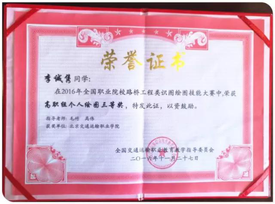 本次竞赛共包含28个省市的44支代表队,共计176名参赛选手,我校道桥系共有4名同学参加。其中15造价4301班的李诚隽同学荣获高职组个人绘图三等奖!