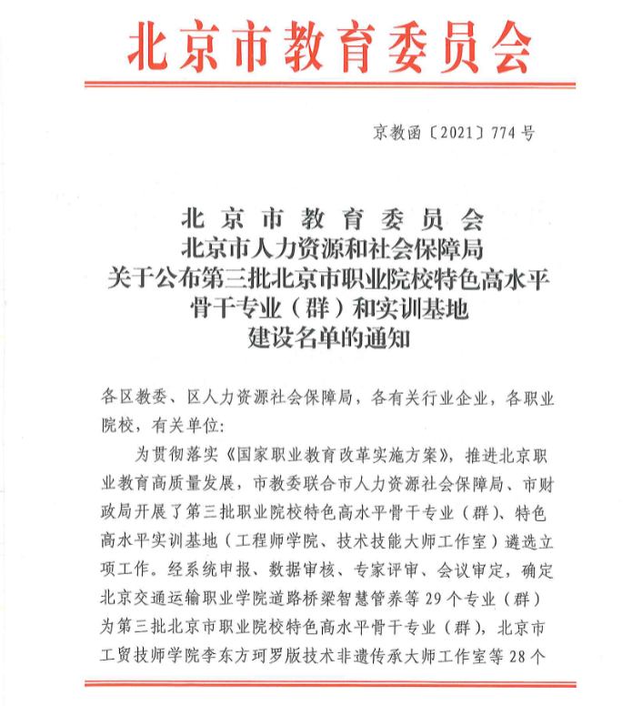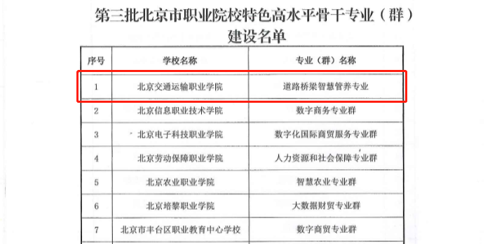 近日,北京市教育委员会、北京市人力资源和社会保障局发布《关于公布第三批北京市职业院校特色高水平骨干专业(群)和实训基地(工程师学院、技术技能大师工作室)建设名单的通知》(京教函〔2021〕774号),PP电子道路桥梁智慧管养专业成功入选。