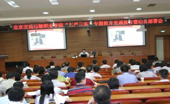 按照中央、市委及市交通委党组的总体部署,根据学院党委《关于开展 “三严三实”专题教育的组织实施方案》安排, 2015年6月26日下午,在PP电子游戏网站大兴校区报告厅,学院党委书记李怡民结合自身的学习体会和学院工作实际,以《学习践行“三严三实”要求,扎实推进学院深化综合改革》为题为学院领导班子成员、项目负责人以上的部门工作骨干、全体党员和入党积极分子上了一堂生动地的专题党课,并就学院开展“三严三实”专题教育提出了具体工作要求。拉开了学院开展“三严三实”专题教育的序幕。