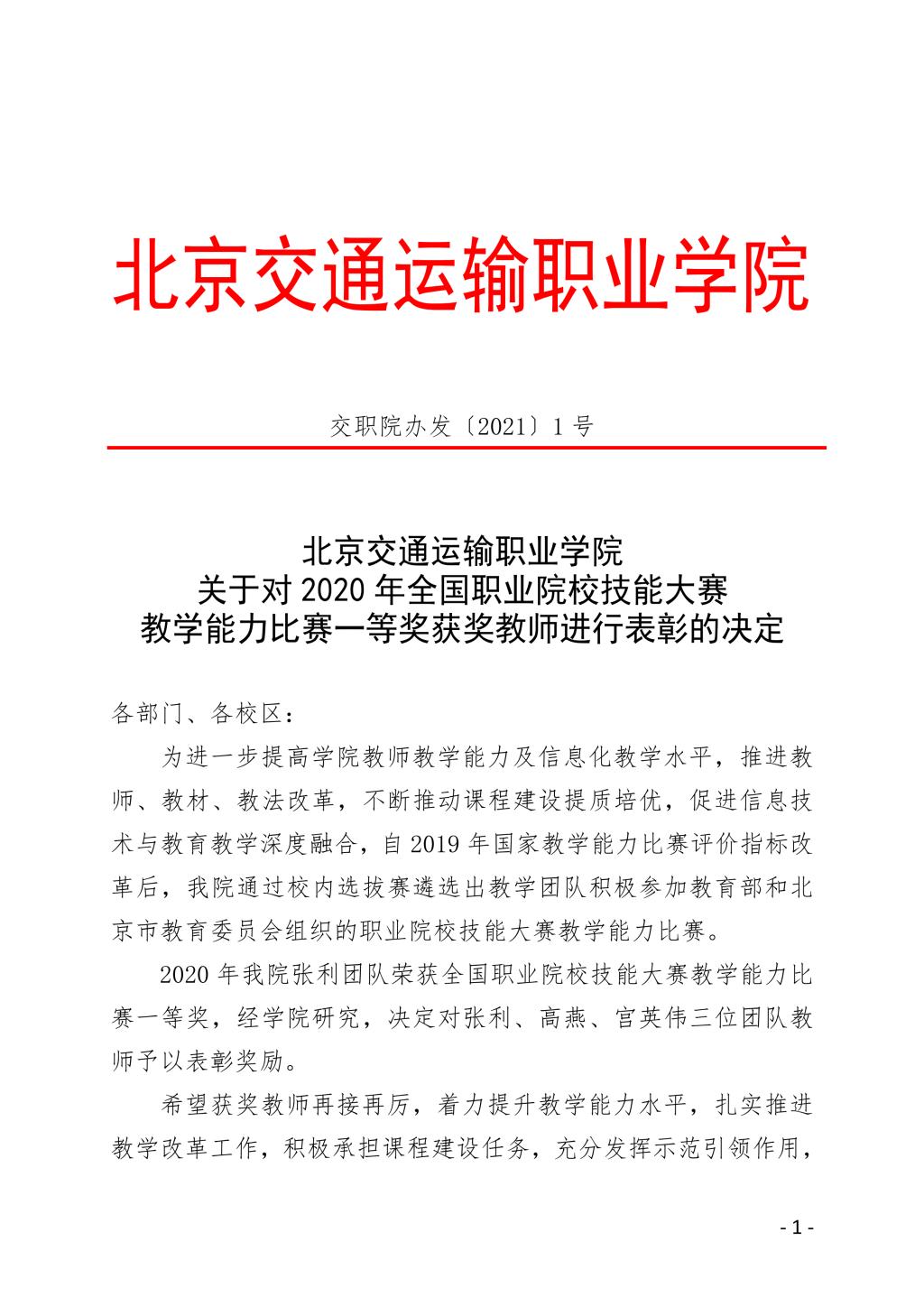 交职院办发〔2021〕1号 关于对2020年全国职业院校技能大赛教学能力比赛一等奖获奖教师进行表彰的决定