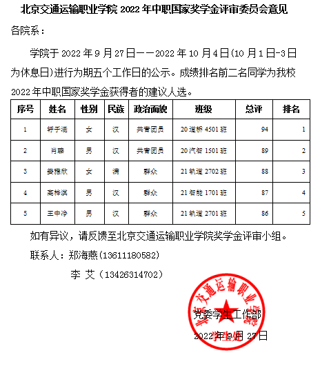 2022年中职国家奖学金评审委员会意见