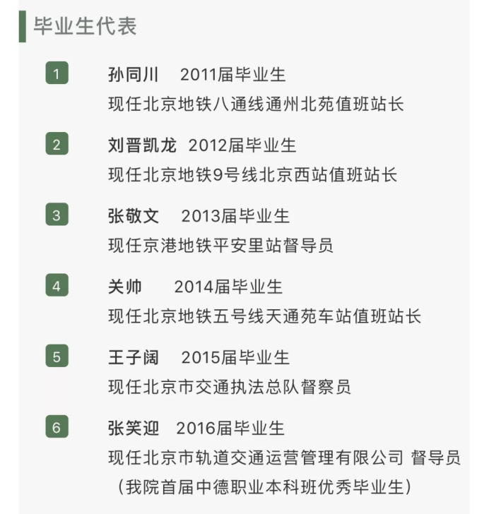 我们为北京市地铁运营企业培养车站中、高级运营管理人员。毕业生可沿着“站务员→综控员→值班站长→站长→站区长”或“站务员→综控员→行车调度员”的职业路径向上发展。