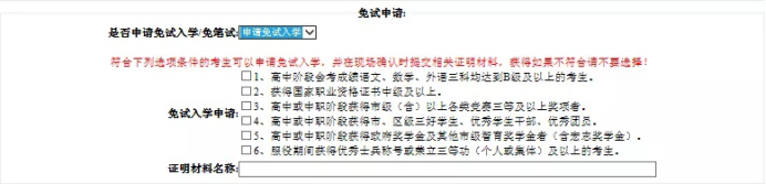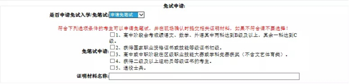 填报志愿(每名考生可以选择”两个志愿专业”)并且选择是否服从调剂,有免试入学或免笔试资格的考生根据自身条件选择相应选项,并填写证明材料名称。