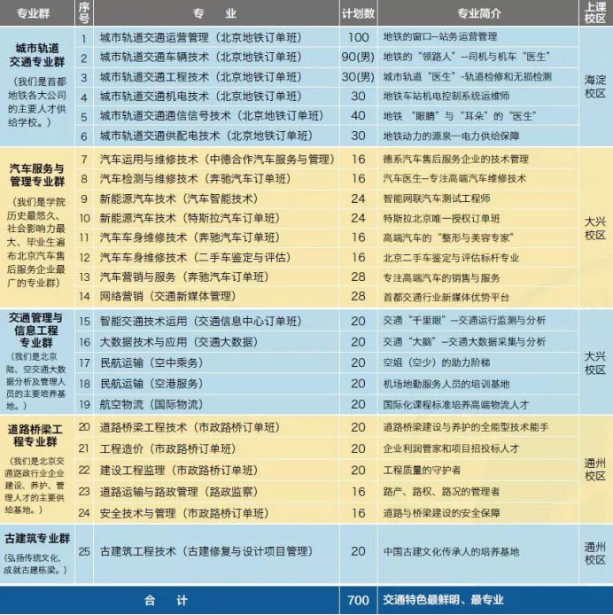 学院目前开设有城市轨道交通专业群、汽车服务与管理专业群、交通管理与信息工程专业群、道路桥梁工程专业群、古建筑专业群五大专业群,已建成汽车运用工程、城市轨道交通、物流管理等国家级、市级重点实训基地,建成具有甲级水平的公路工程质量检测中心,建成全国唯一的传承古代建设技术与工艺的中国古建筑实训基地。目前,学院城市轨道交通专业群、汽车服务与管理专业群入选第一批北京市特色高水平骨干专业(群)建设名单。边精一古建营造工作室入选第一批北京市职业院校技术技能大师工作室建设名单。