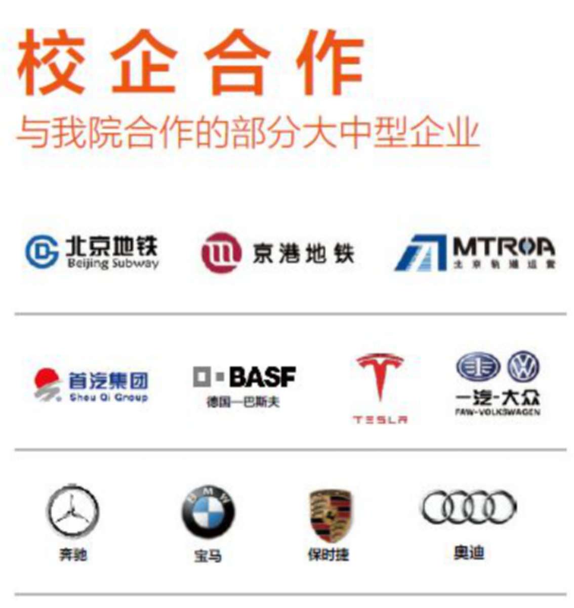 学院是全国城市轨道运输类专业指导委员会主任单位,与北京地铁联合建设有国内最先进的城市轨道交通实训基地,聘请北京地铁各运营单位和设备维修单位的技术骨干和专家为特聘教授参与课程教学和专业建设,同时引进德国德累斯顿工业大学ITS(智能交通)课程共建中德职业本科课程班。
