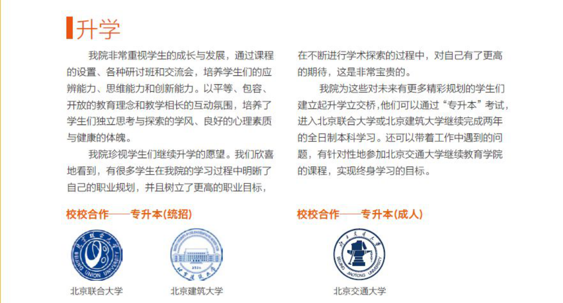 同时与北京公交集团、北京首都公路发展集团有限公司等单位开展交通枢纽运营管理人员;同京东集团、中外运敦豪、北京邮政速运总公司等开展跨境电商运营、国际货运代理人员;同北京国际航空公司、首都航空公司、东方航空公司等开展空中乘务、空港服务人员的合作办学,为其输送高素质、复合型交通管理专门人才。