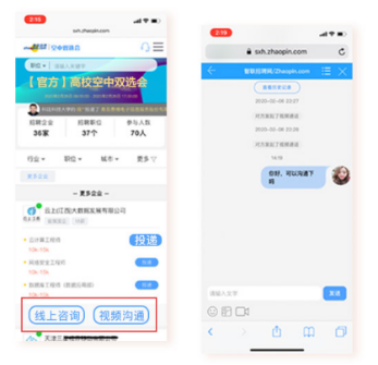 (3)查信息、投简历、上线沟通。浏览企业招聘信息【投递】,活动开场后,可接收企业发起的文字/视频沟通提示,可主动发起【在线沟通】【视频沟通】,若企业不在线将收到短信提示。