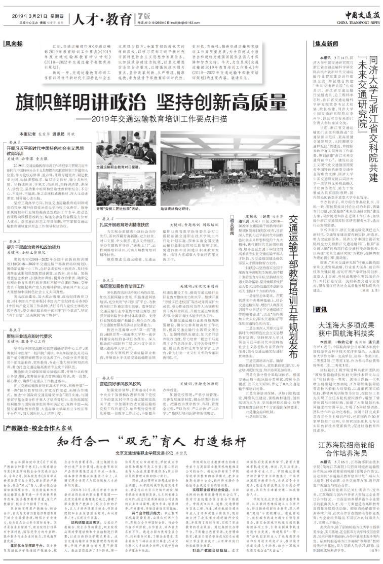 继去年国务院印发《关于深化产教融合的若干意见》,六部委联合印发《职业学校校企合作促进办法》后,今年2月,国务院发布《国家职业教育改革实施方案》,提出促进产教融合,校企“双元”育人,推动校企全面加强深度合作。这些措施都为交通运输职业教育进一步开展教育教学改革,提升教育教学质量,深化产教融合、校企合作指明了方向。