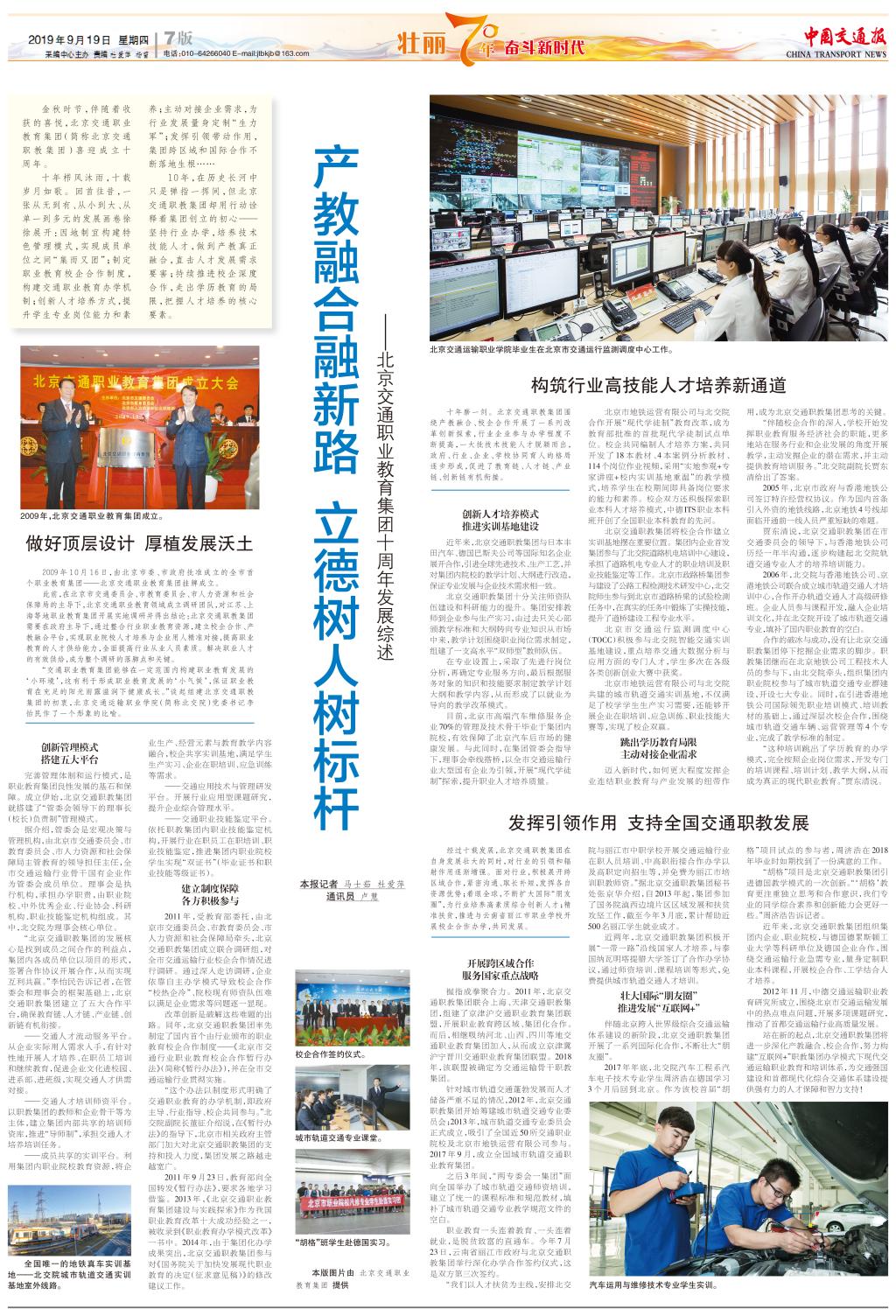 十年磨一剑。北京交通职教集团围绕产教融合、校企合作开展了一系列改革创新探索,行业企业参与办学程度不断提高,一大批技术技能人才脱颖而出,政府、行业、企业、学校协同育人的格局逐步形成,促进了教育链、人才链、产业链、创新链有机衔接。