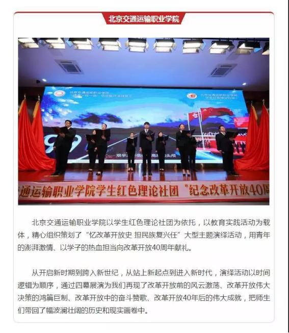 在国家博物馆举办的“伟大的变革”——庆祝改革开放40周年大型展览自开幕以来吸引了大批参观者。在这场盛宴中,除了实地参观,北交院的青年志愿者们,通过另外一种参与方式,致敬改革开放40周年伟大成就。作为28所重点高校中唯一一所高职院校,北交院参加并承担的是12月25日的志愿服务工作。30名优秀青年圆满完成高校系统志愿服务任务的收官,用实际行动向改革开放40周年献上祝福。