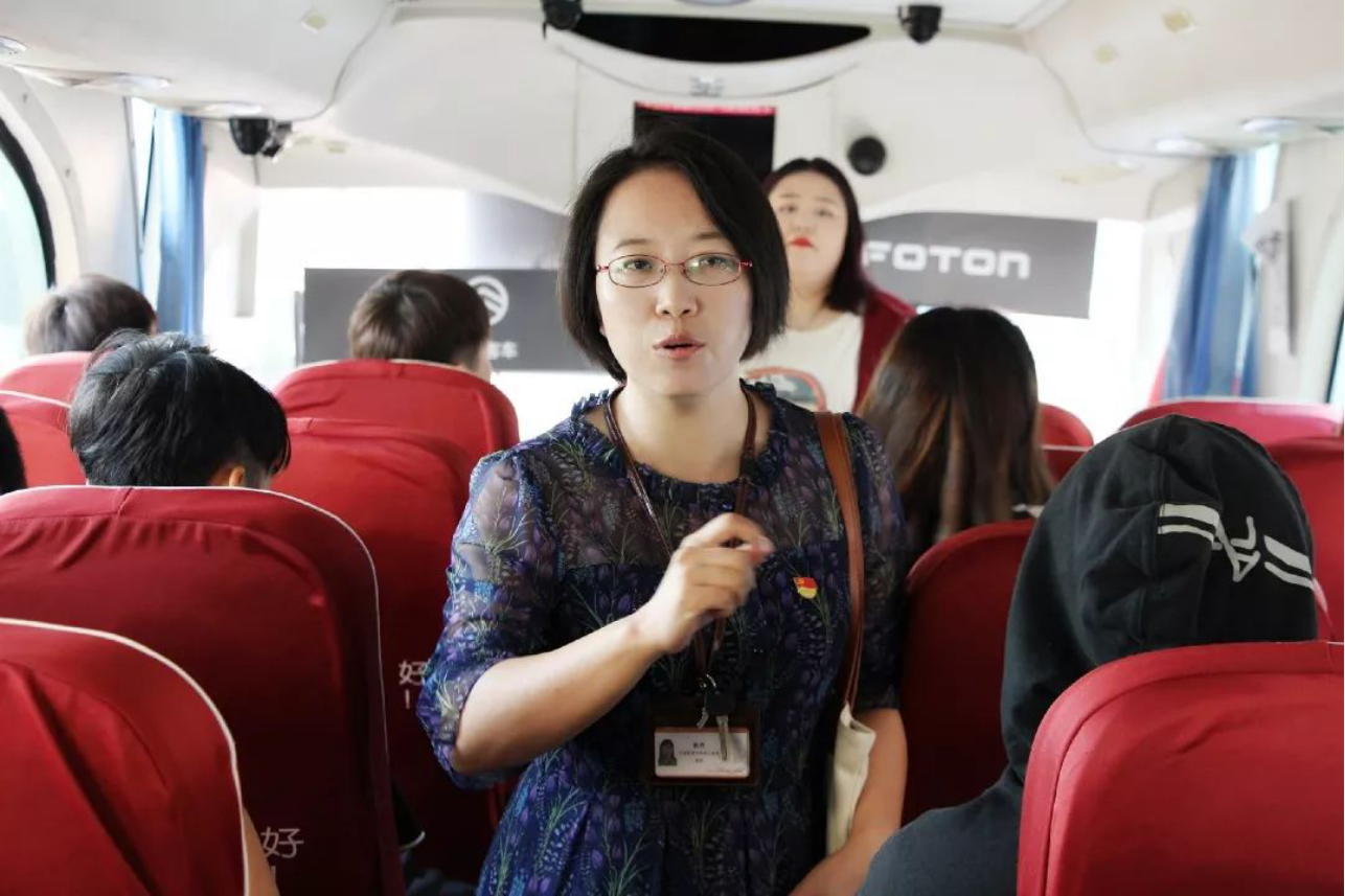 老师在车上对“模拟乘客”的内容、北京大兴国际机场的情况进行讲解。