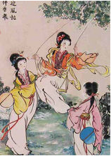 荡秋千是中国古代清明节习俗之一。五代王仁裕《开元天宝遗事》载“天宝宫中至寒食节竟竖秋千,令宫嫔辈戏笑以为宴乐。帝呼为半仙之戏,都中士民因而呼之”,宋代宰相文彦博诗《寒食日过龙门》,诗中描写为 “桥边杨柳垂青线,林立秋千挂彩绳。”秋千,意即揪着皮绳而迁移。