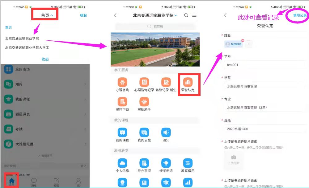 2、校级以上荣誉认定由学生个人登录学习通APP,上传荣誉信息,进行线上认定。