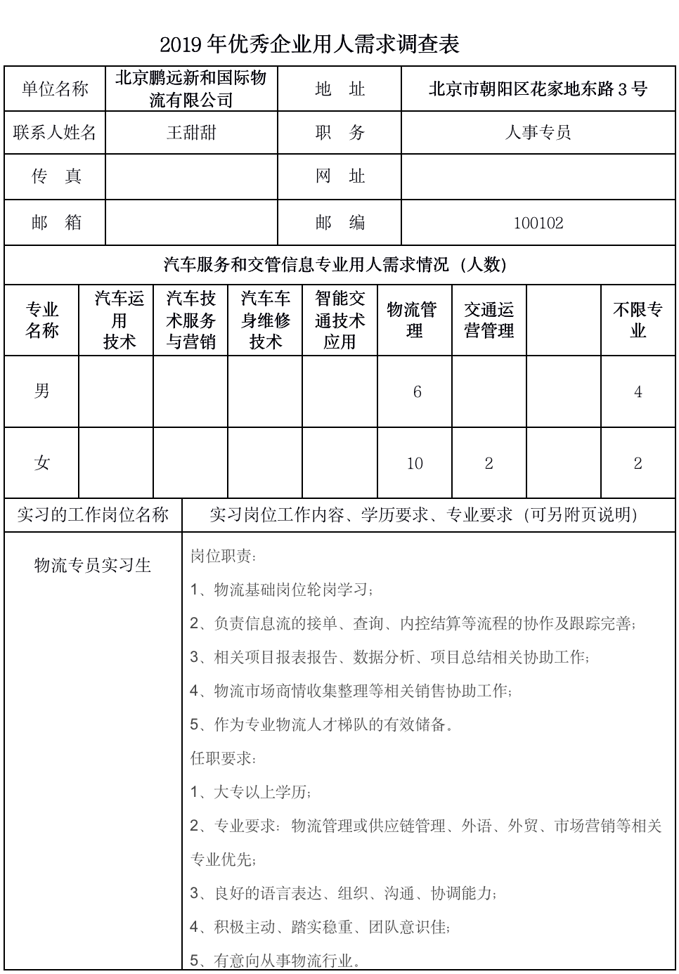 鹏远国际物流公司2019年企业需求