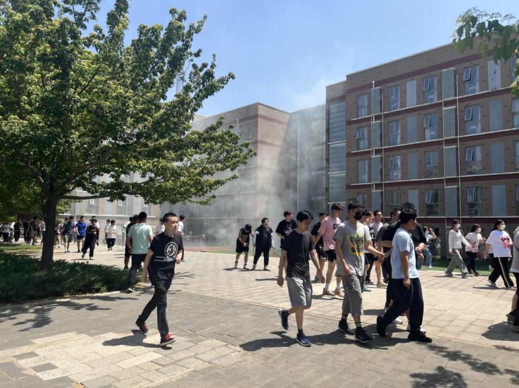 5月18日中午,随着演练倒计时的一声令下,校园公寓传来阵阵浓烟,消防警铃随即响起,拉开了本学期应急疏散演练的帷幕。